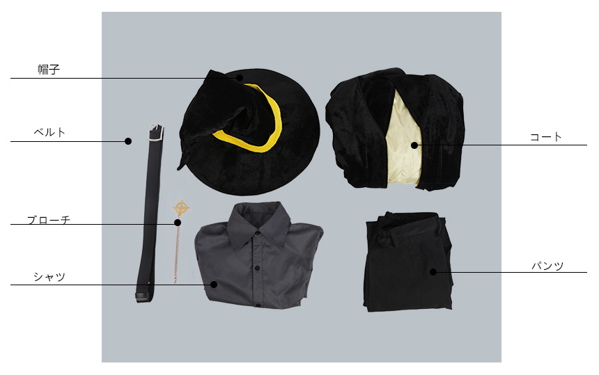 コート、シャツ、パンツ、飾り物(帽子、ベルト、ブローチ)