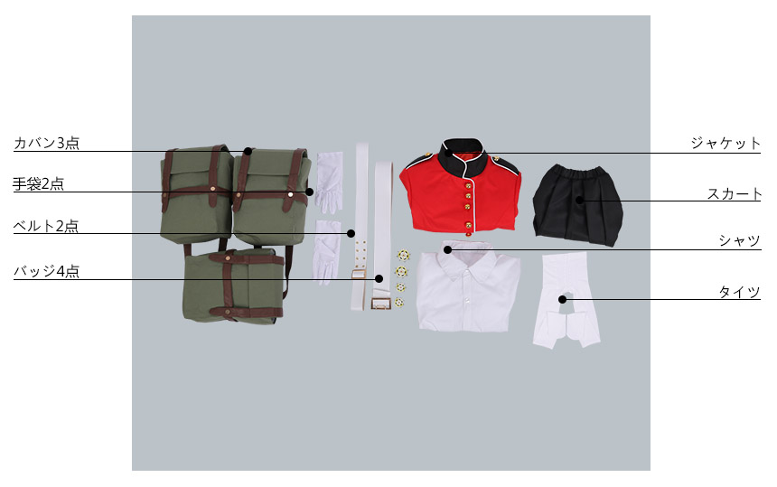 ジャケット、シャツ、スカート、飾り物(髪紐、手袋2点、ベルト2点、バッジ4点、カバン3点、ニーソックス2点)