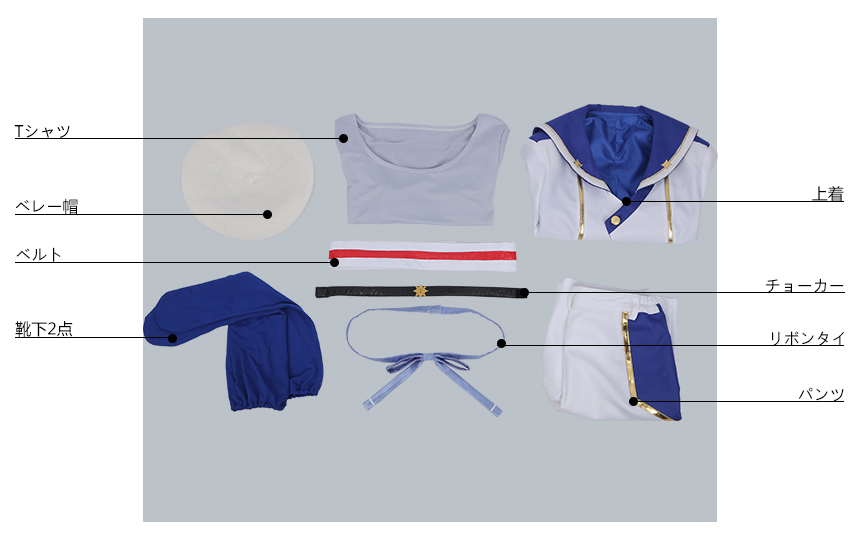 ベレー帽、チョーカー、リボンタイ、ベルト、靴下2点も付属しています。