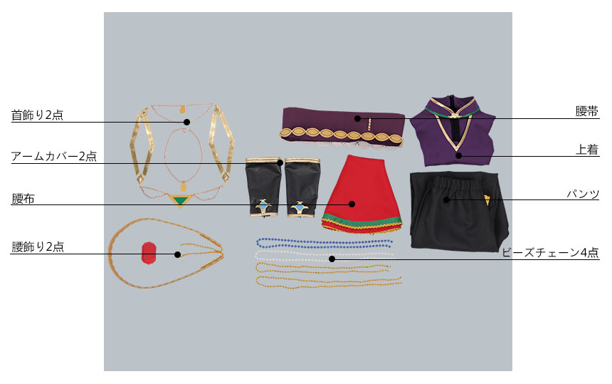 上着、パンツ、飾り物(首飾り2点、腰帯、腰布、腰飾り2点、ビーズチェーン4点、アームカバー2点)