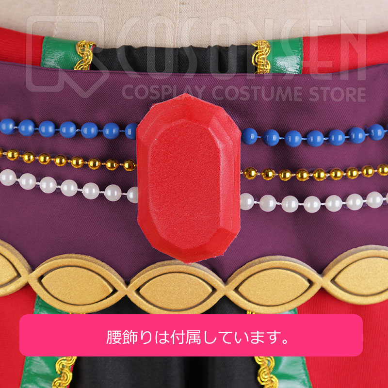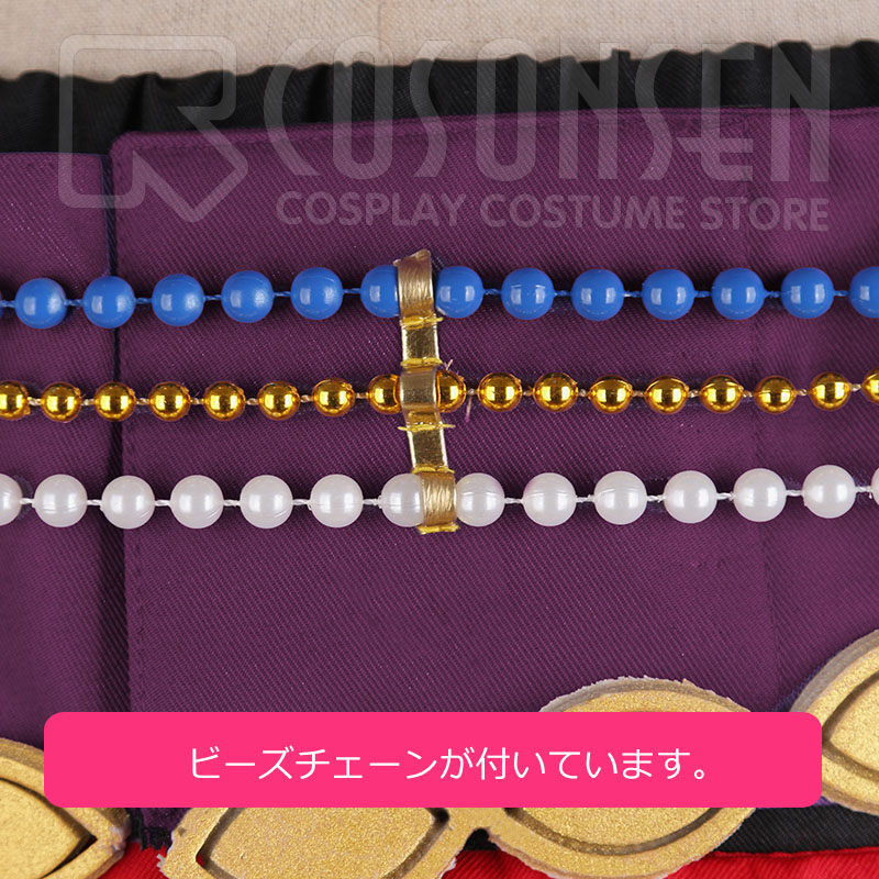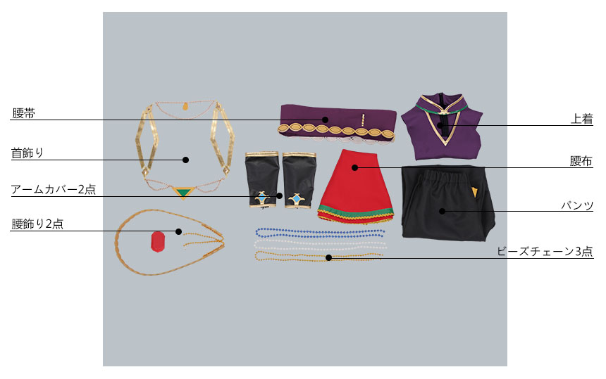首飾り2点、腰帯、腰布、腰飾り2点、ビーズチェーン4点、アームカバー2点も付属しています。