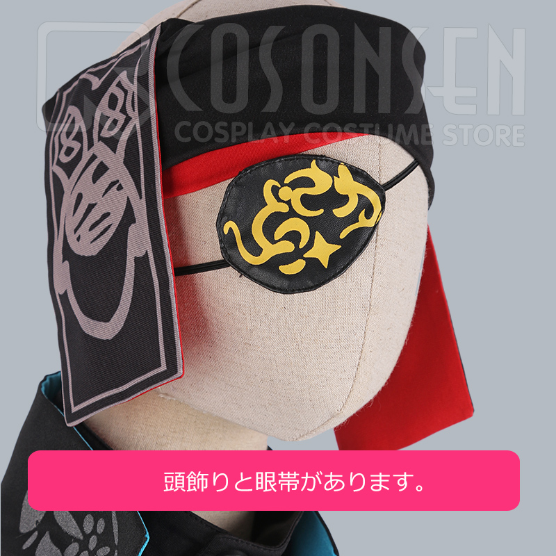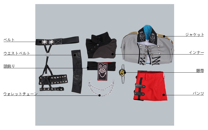 頭飾り、眼帯、ウエストベルト、ベルト、ウォレットチェーンも付属しています。