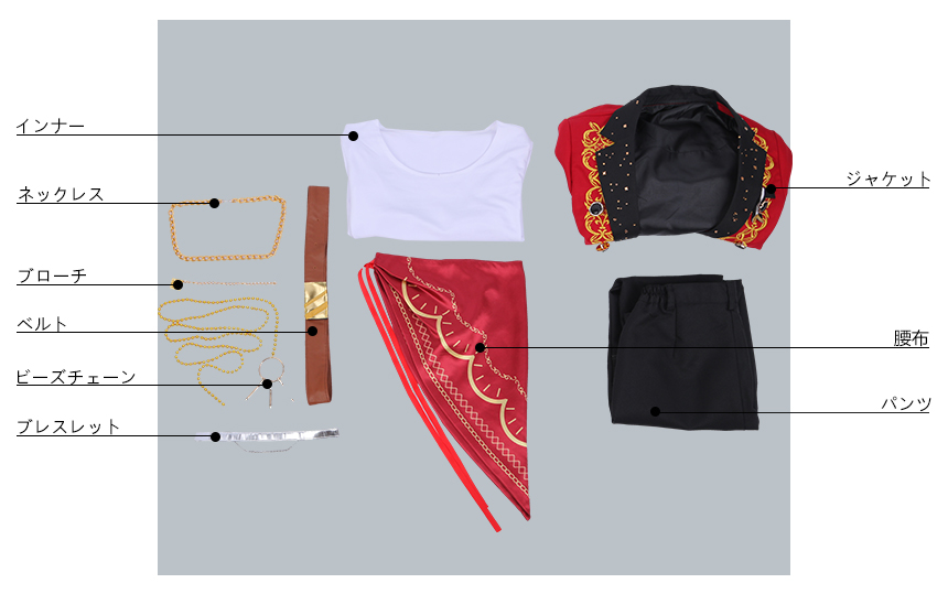 ジャケット、インナー、パンツ、飾り物(腰布、ベルト、ネックレス、ブローチ、ビーズチェーン、ブレスレット)