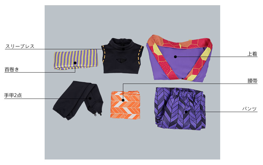 上着、スリーブレス、パンツ、飾り物(首巻き、腰帯、手甲2点)