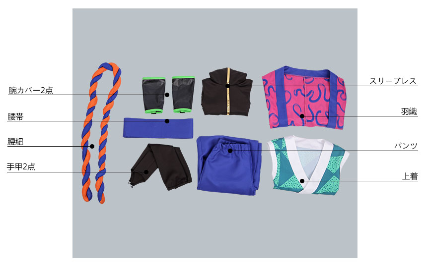 羽織、上着、スリーブレス、パンツ、飾り物(腰紐、腰帯、手甲2点、腕カバー2点)