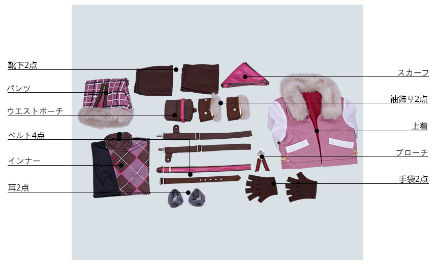 上着、インナー、パンツ、飾り物(耳2点、ブローチ、スカーフ、ベルト4点、ウエストポーチ、袖飾り2点、手袋2点、靴下2点)