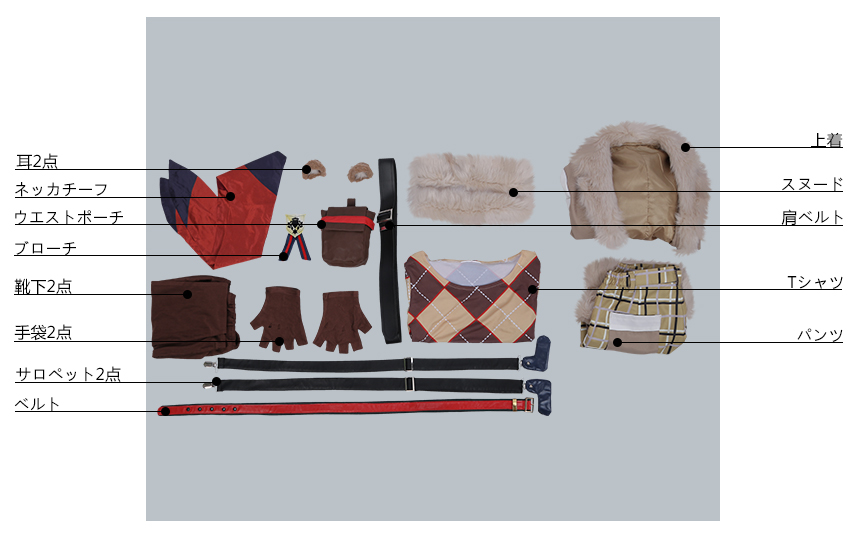 上着、Tシャツ、パンツ、飾り物(耳2点、ブローチ、スヌード、ネッカチーフ、ベルト、ウエストポーチ、肩ベルト、サロペット2点、手袋2点、靴下2点)