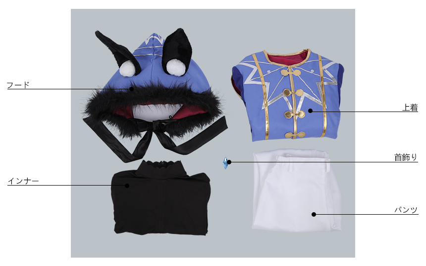 上着、インナー、パンツ、飾り物(フード、首飾り)