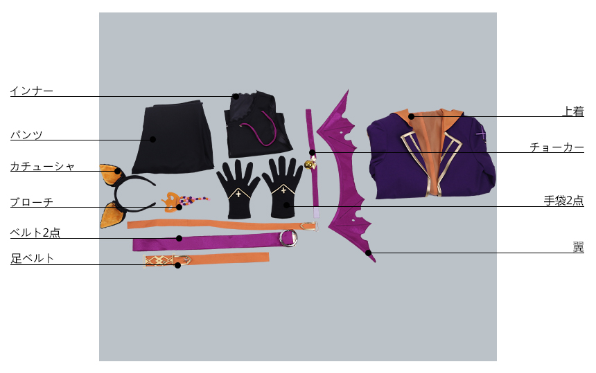 上着、インナー、パンツ、飾り物(手袋2点、ブローチ、チョーカー、ベルト、腕ベルト、足ベルト、翼、カチューシャ)