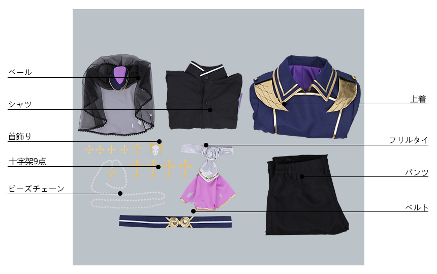 上着、シャツ、パンツ、飾り物(ベール、フリルタイ、首飾り、十字架9点、ビーズチェーン、ベルト)
