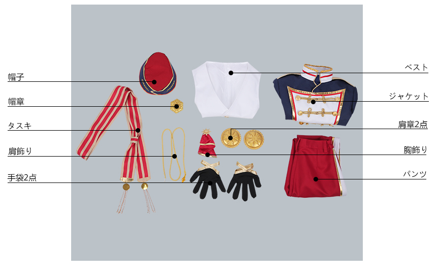 ジャケット、ベスト、パンツ、飾り物(帽章、帽子、肩章2点、肩飾り、胸飾り、タスキ、手袋2点)