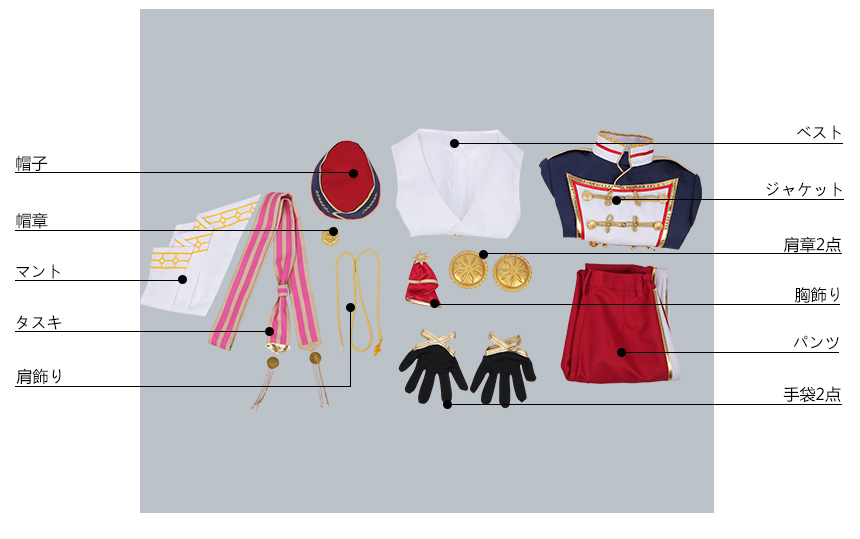 マント、帽章、帽子、肩章2点、肩飾り、胸飾り、タスキ、手袋2点も付属しています。