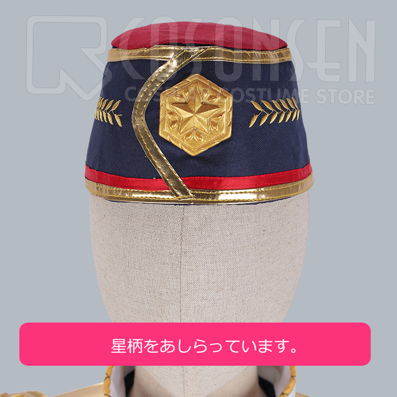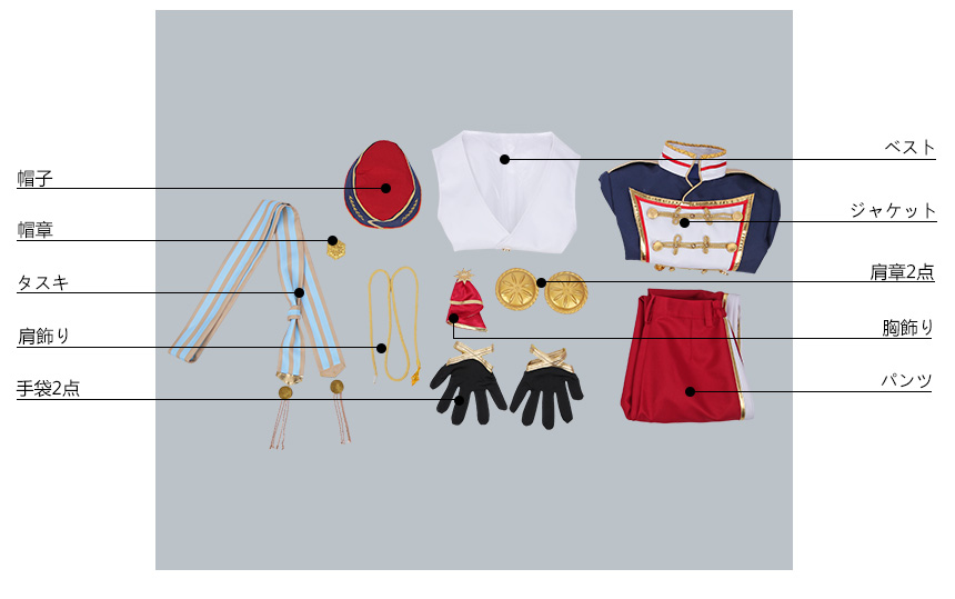 帽章、帽子、肩章2点、肩飾り、胸飾り、タスキ、手袋2点も付属しています。