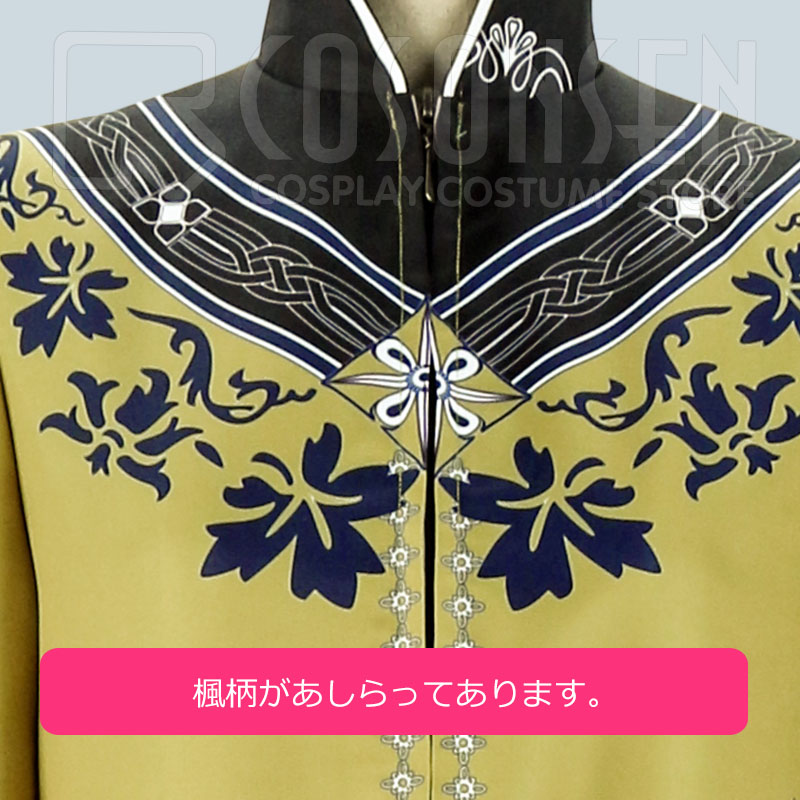 ポリエステルツイルで製作されました。袖口にパールのような丸いボタンが付いています。袖と胸元に楓の葉模様がプリントされています。