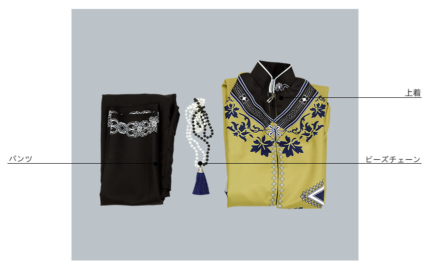 上着、パンツ、飾り物(ビーズチェーン)