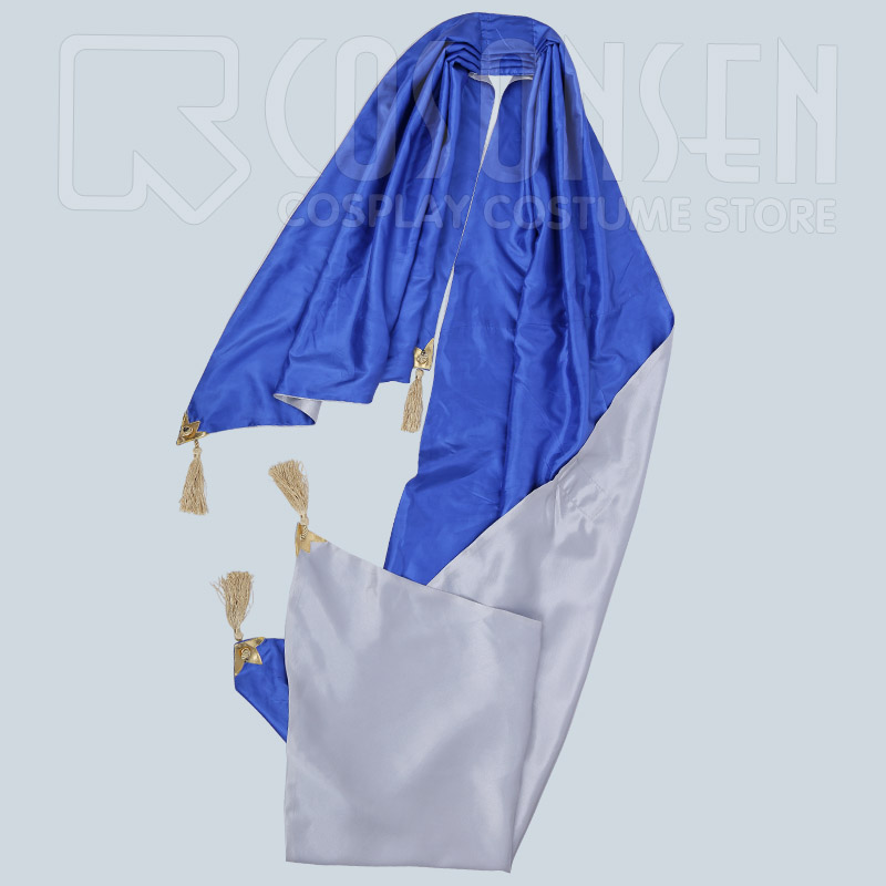 サテンで製作されました。裾に房飾りが施されます。裏地がブルーをしています。肩のところについたマジックテープで着用します。