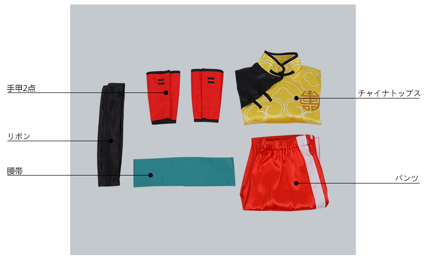 チャイナトップス、パンツ、飾り物(腰帯、リボン、手甲2点)
