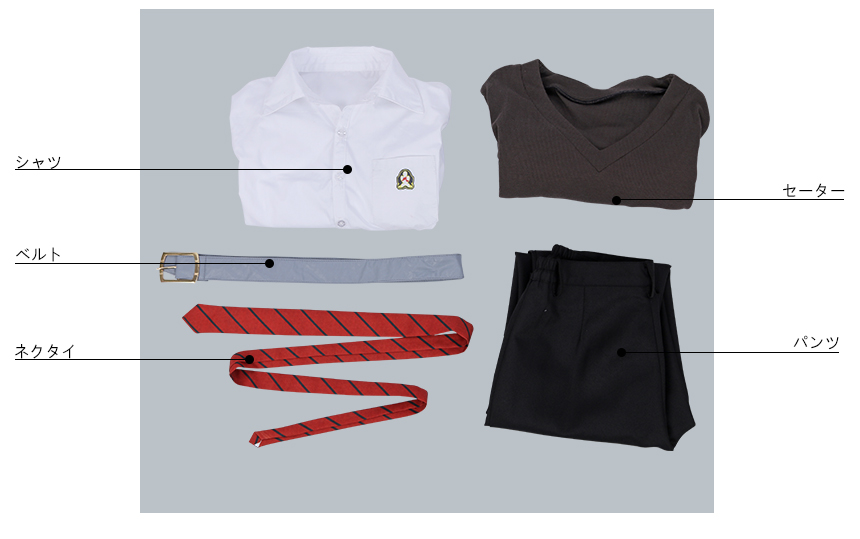 セーター、シャツ、パンツ、飾り物(ネクタイ、ベルト)