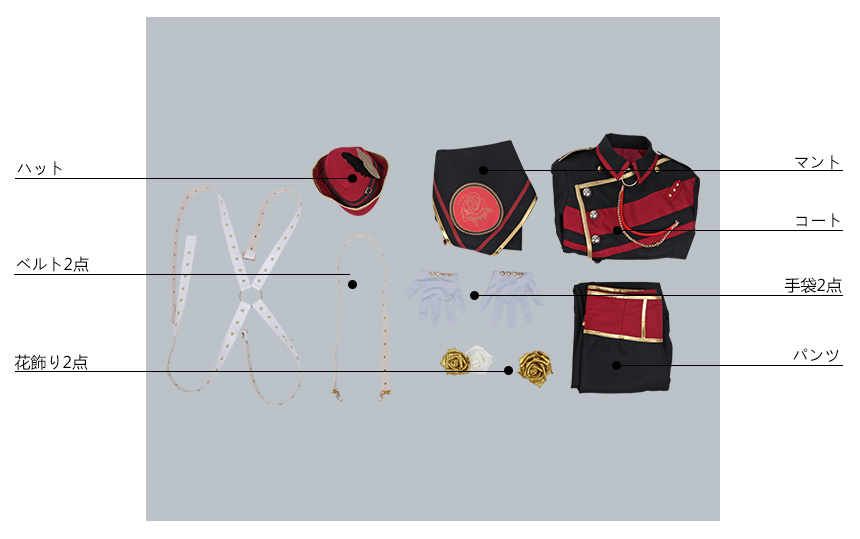 マント、コート、パンツ、飾り物(ハット、花飾り2点、ベルト2点、手袋2点)