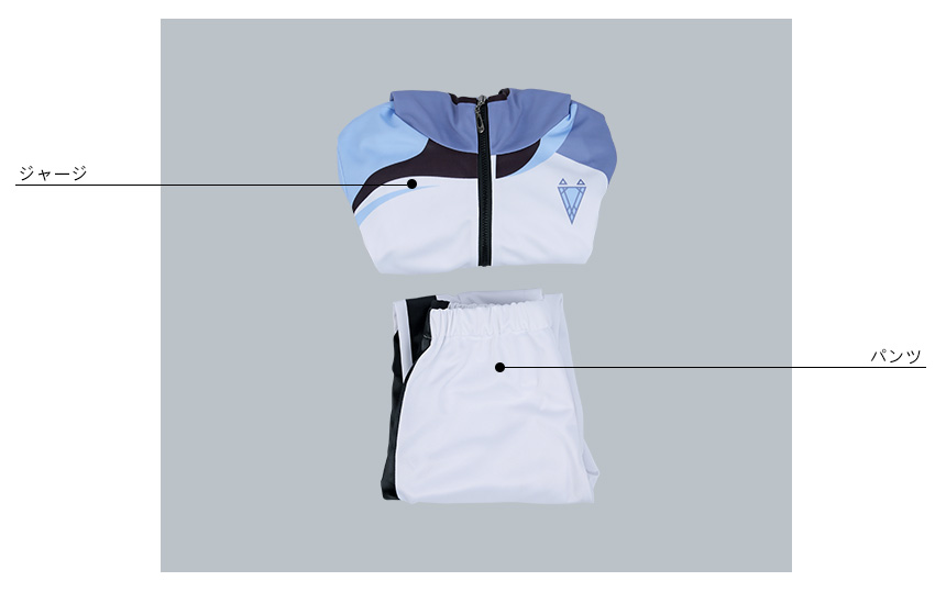 ジャージ生地で製作されました。白と青を基調としたフード付きのジャージです。裾にリブ生地が施されて、横方向の伸縮性に富んでいます。
