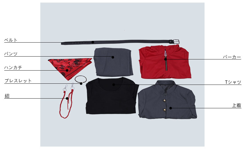 上着、パーカー、Tシャツ、パンツ、飾り物(ベルト、紐、ブレスレット、ハンカチ)