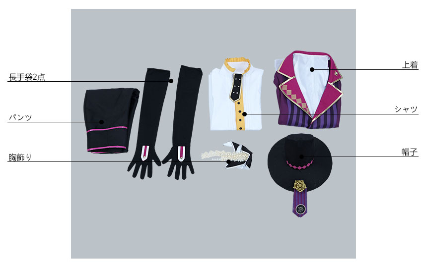 上着、シャツ、パンツ、飾り物(胸飾り、長手袋2点、帽子)