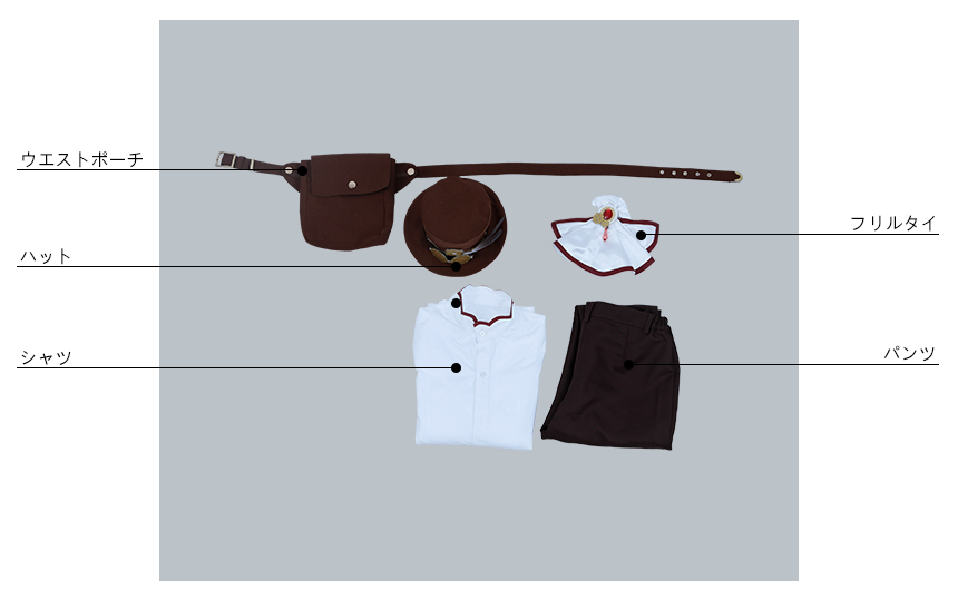 ハット、フリルタイ、肩章2点、手袋2点、腕飾り2点、ベルト2点、ウエストポーチも付属しています。