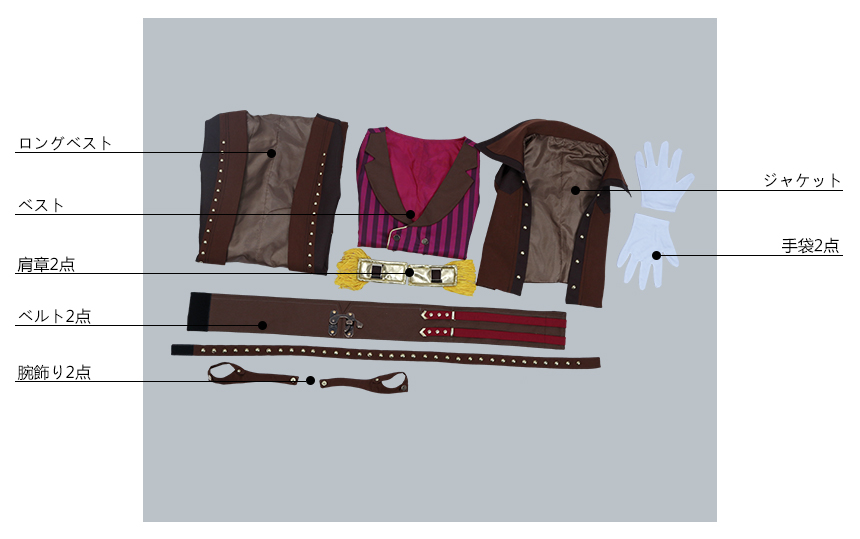 ジャケット、ロングベスト、ベスト、シャツ、パンツ、飾り物(ハット、フリルタイ、肩章2点、手袋2点、腕飾り2点、ベルト2点、ウエストポーチ)
