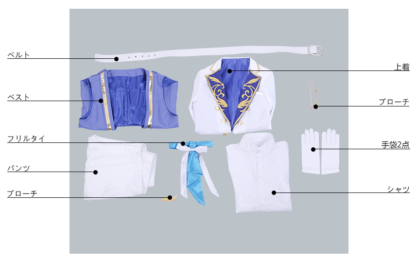 上着、ベスト、シャツ、パンツ、飾り物(フリルタイ、ブローチ2点、ベルト、手袋2点)