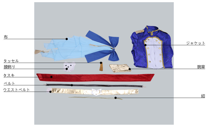 紐、タッセル、腕章、タスキ、ウエストベルト、ベルト、腰飾り、布も付属しています。