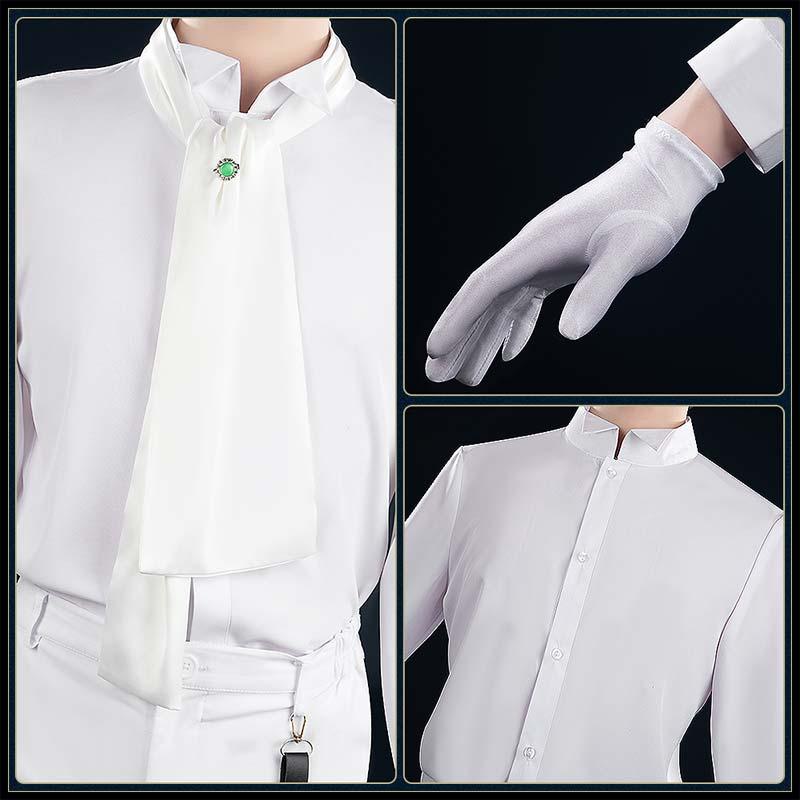 シャツ生地で製作しています。白い立襟シャツが付属の白いスカーフと緑の輝く胸飾りと組み合わせることで、フォーマルで優雅な雰囲気に仕上がります。