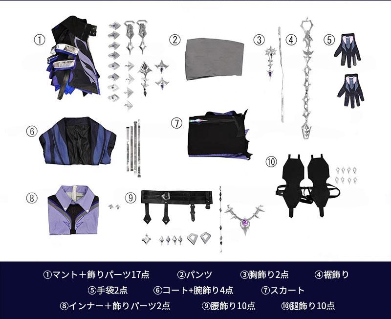 コート、マント、インナー、パンツ、スカート、飾り物(手袋2点、裾飾り、飾りパーツ19点、胸飾り2点、腕飾り4点、腰飾り10点、腿飾り10点)