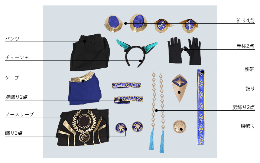 ケープ、ノースリーブ、パンツ、飾り物(チューシャ、腕飾り2点、房飾り2点、手袋2点、飾り7点、腰飾り、腰帯)