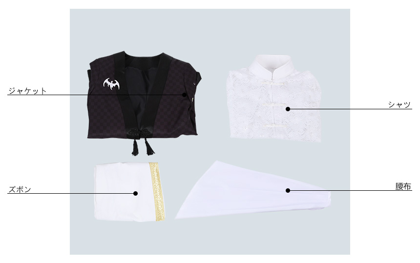 ジャケット、シャツ、ズボン、飾り物(腰布)
