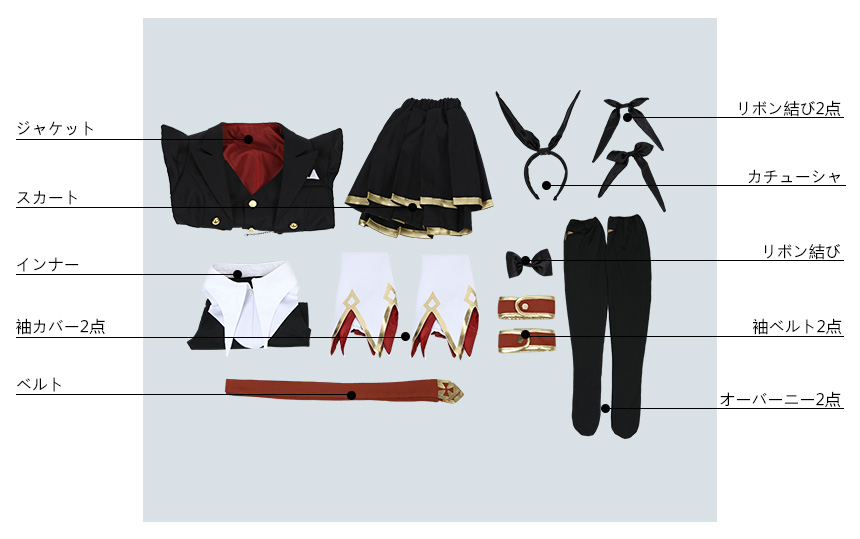 ジャケット、インナー、スカート、飾り物(リボン結び3点、袖カバー2点、袖ベルト2点、ベルト、カチューシャ、オーバーニー2点)