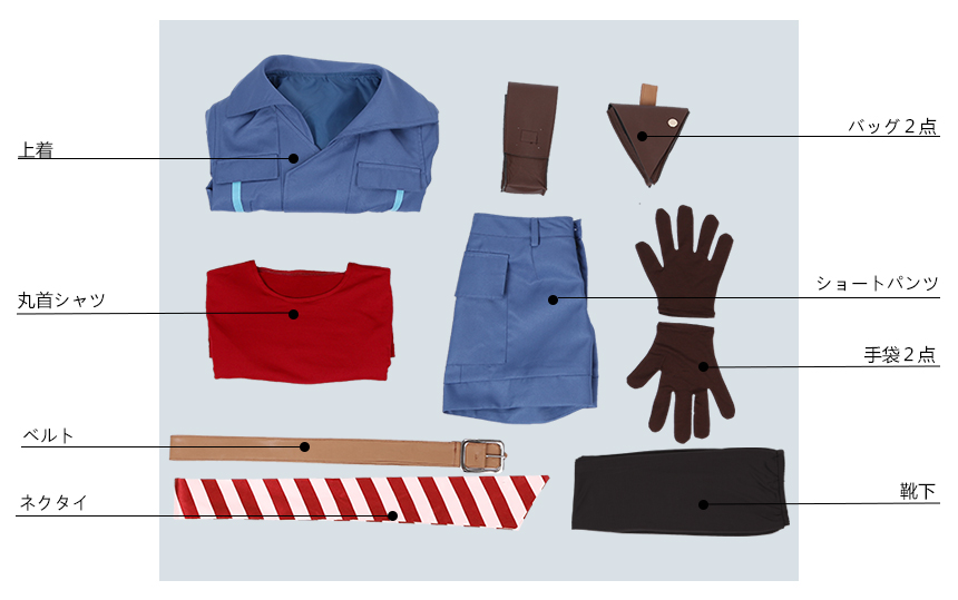 上着、ショートパンツ、丸首シャツ、飾り物(ネクタイ、ベルト、バッグ2点、手袋2点