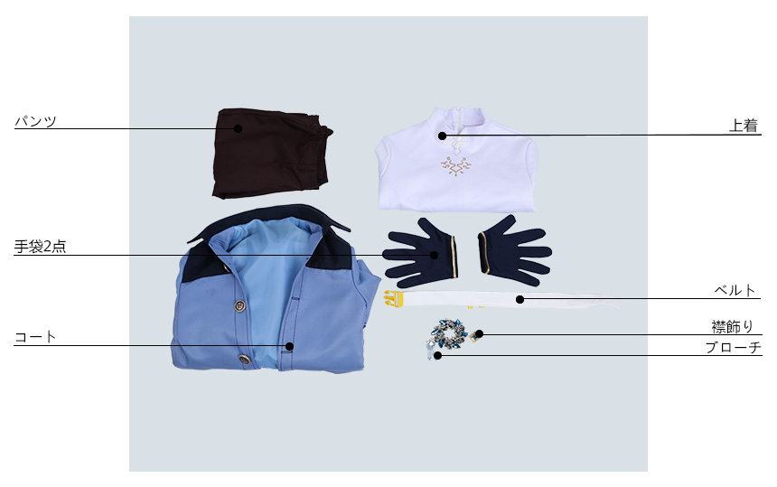 コート、上着、パンツ、飾り物(襟飾り、ベルト、手袋2点)