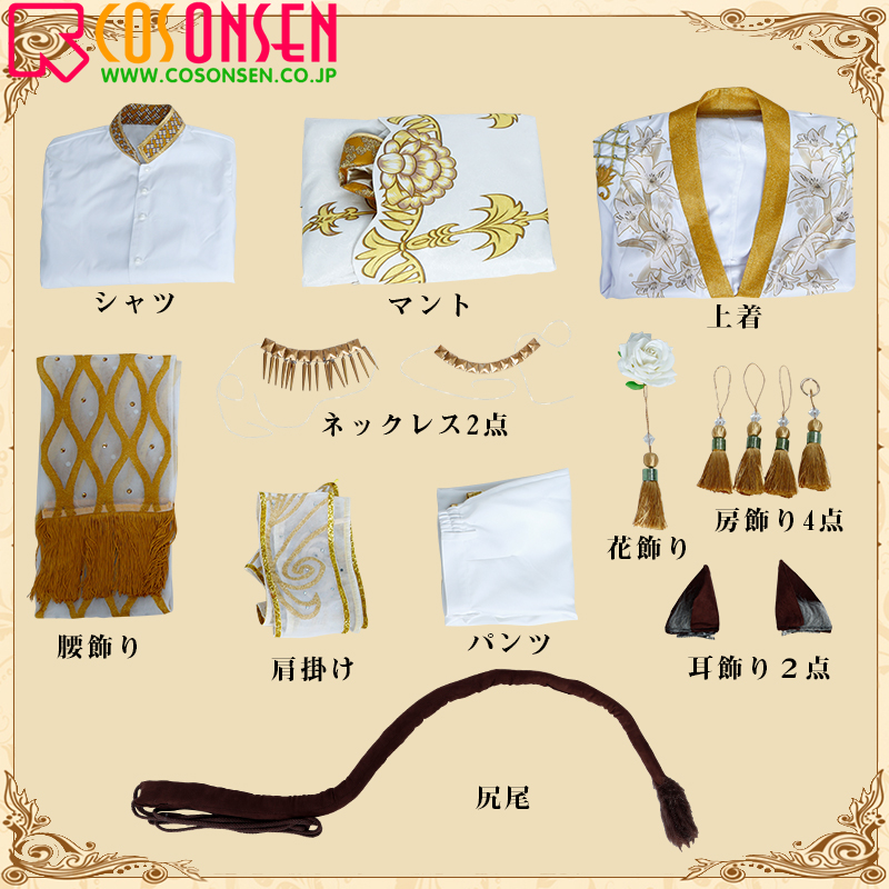 マント、上着、シャツ、パンツ、飾り物(ネックレス2点、肩掛け、房飾り4点、花飾り、腰飾り、耳2点、尻尾)