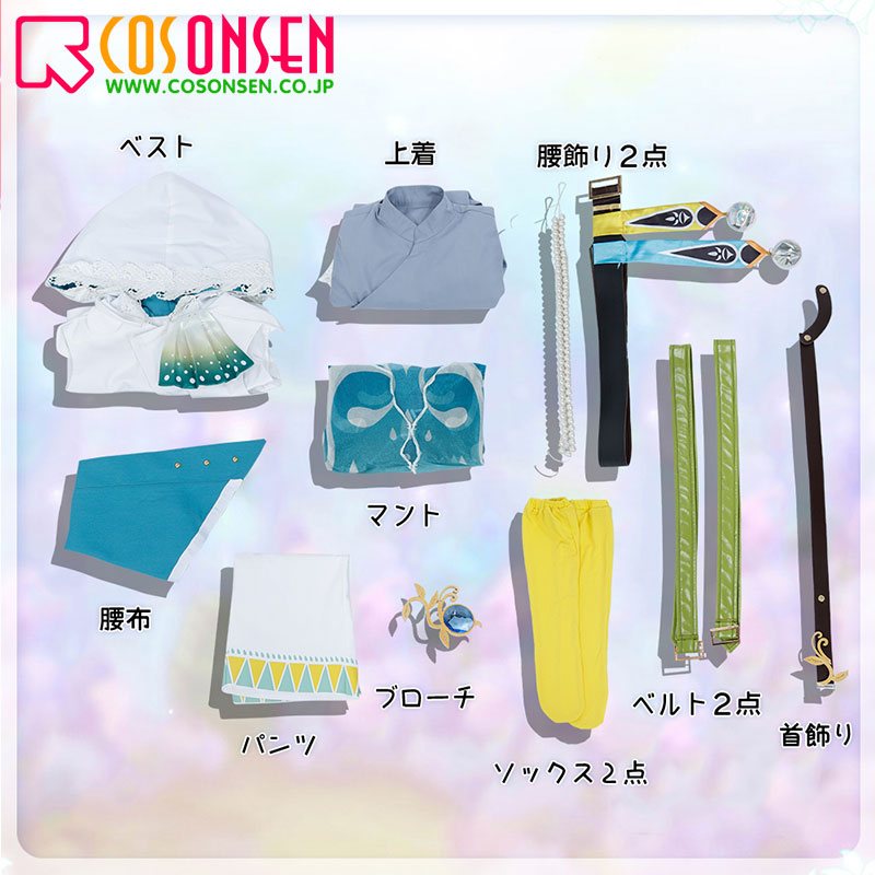 マント、首飾り、ブローチ、腰飾り2点、ベルト2点、腰布、ソックス2点も付属しています。