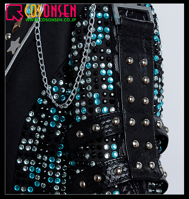 ポリエステルツイルで製作しています。スパンコールが施されて、ギラギラしています。襟に銀色のラインを付けています。袖口は折り返しのデザインで、鎖飾りが付いています。