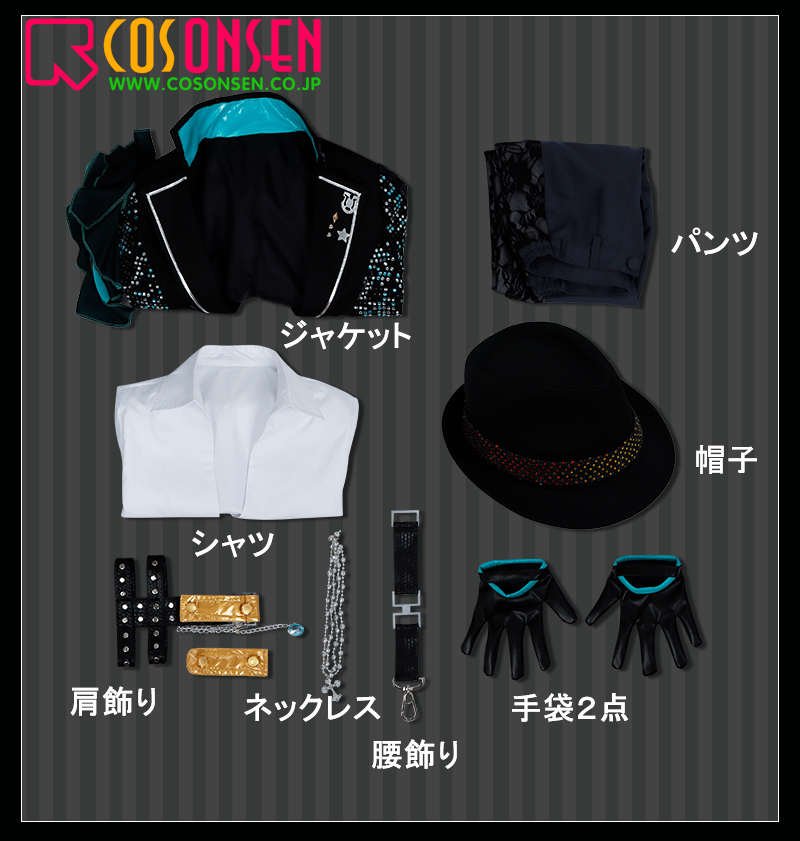 ジャケット、シャツ、パンツ、飾り物(帽子、手袋2点、肩飾り、ネックレス、腰飾り)