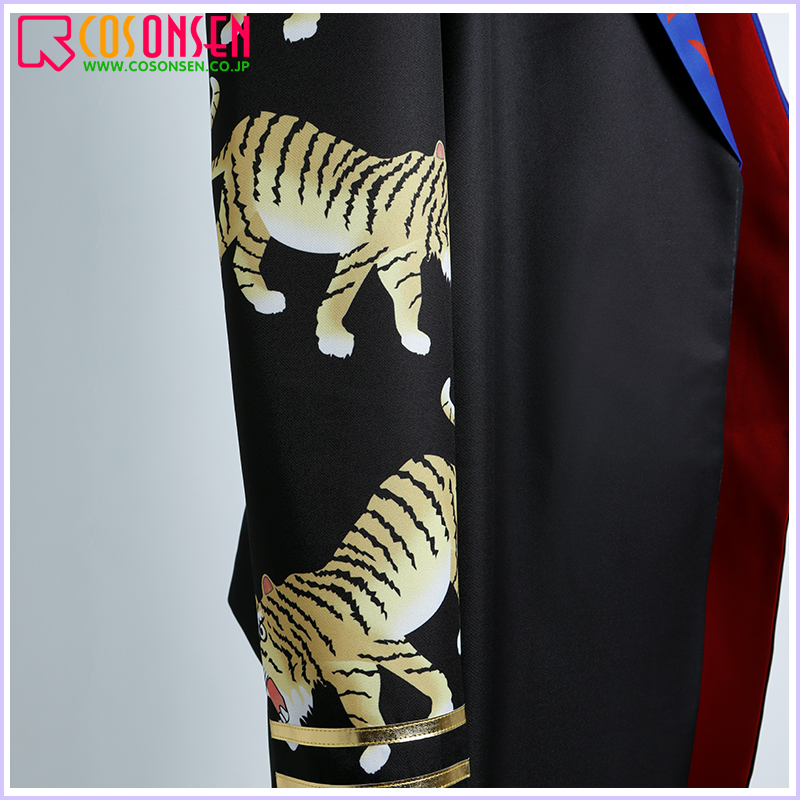 ポリエステルツイルで製作しています。フードが付いています。袖に虎の模様がプリントされて、金色のラインを縫い付けています。