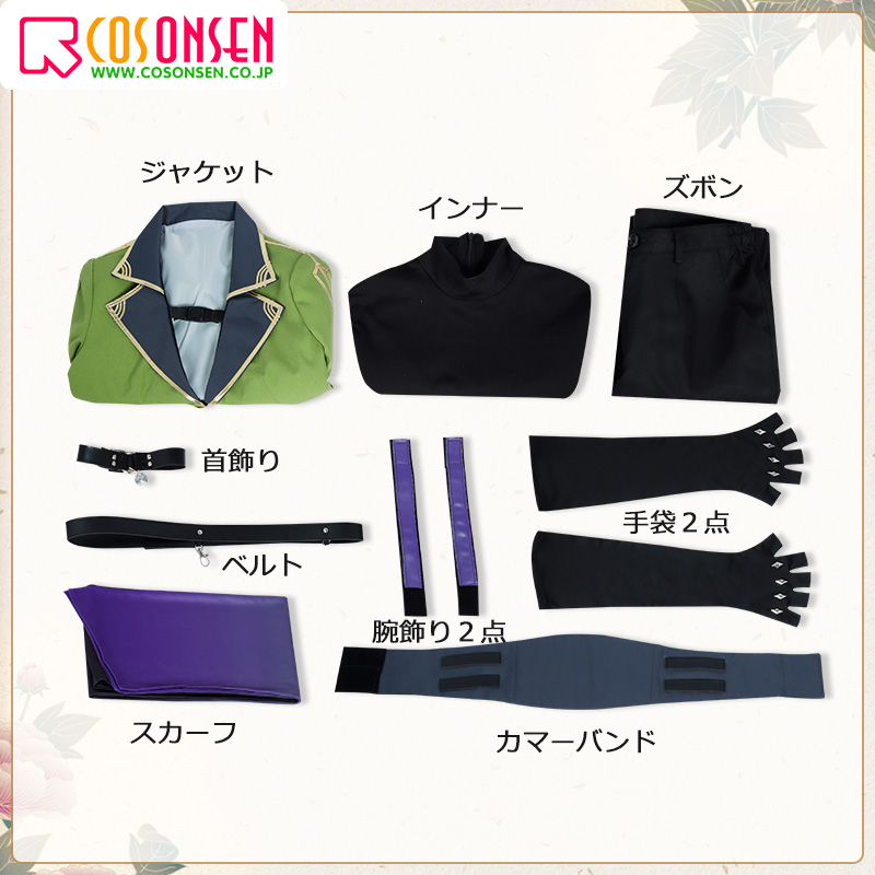 ジャケット、インナー、ズボン、飾り物(首飾り、スカーフ、カマーバンド、手袋2点、腕飾り2点、ベルト)