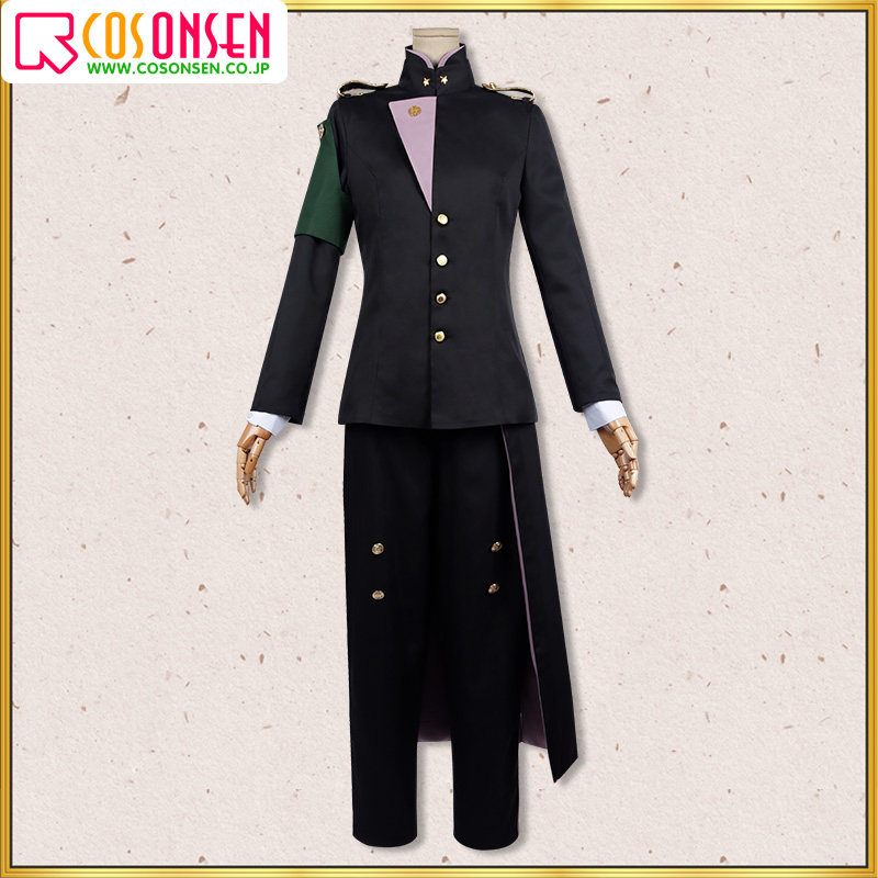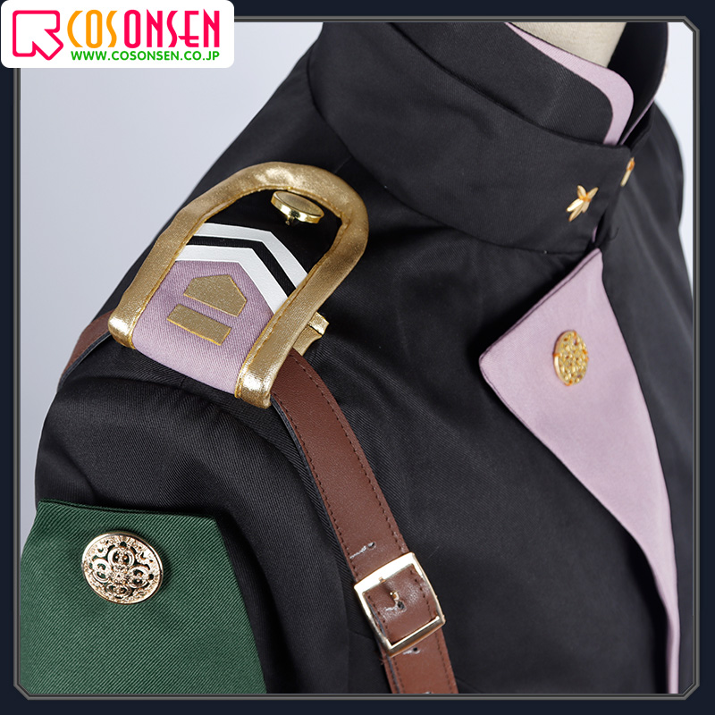 ポリエステルギャバで制作しています。黒を基準として、立ち襟なデザインに仕上がっています。襟にピンク色の合皮で縁取りされています。襟とフロントにいくつの金色のボタンが施されています。肩に特徴的な肩章が縫い付けています。忠実に再現するよう心掛けています。