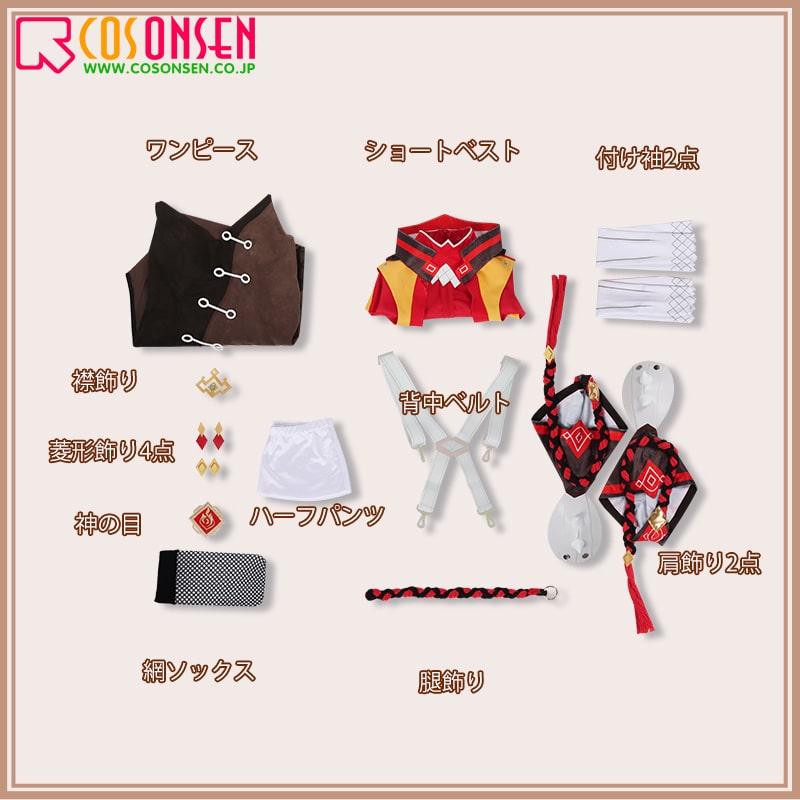 ショートベスト、ワンピース、ハーフパンツ、飾り物(付け袖2点、襟飾り、菱形飾り4点、神の目、背中ベルト、肩飾り2点、網ソックス、腿飾り)