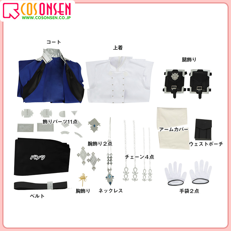 コート、上着、パンツ、飾り物(ベルト、ウェストポーチ、腿飾り2点、胸飾り、ネックレス、アームカバー2点、手袋2点、腕飾り2点、チェーン4点、飾りパーツ11点)