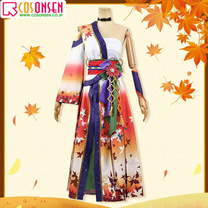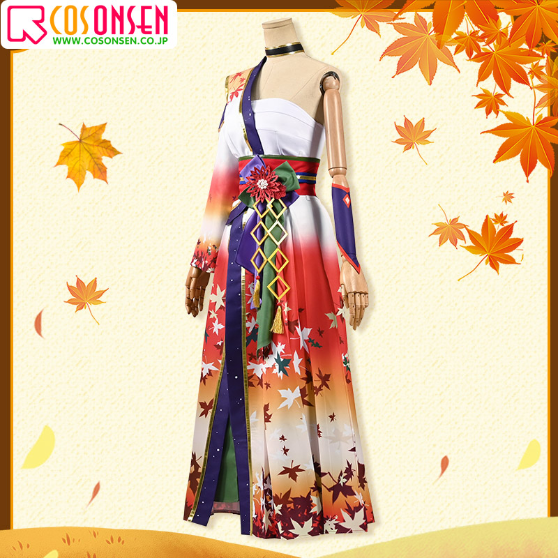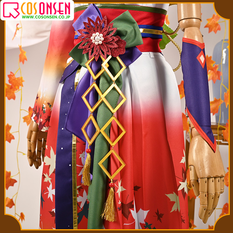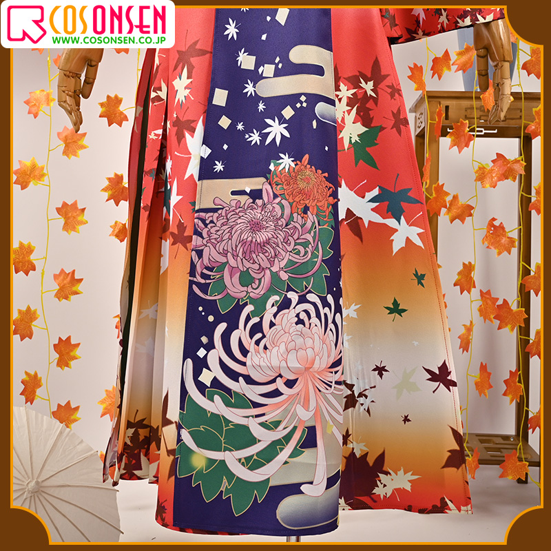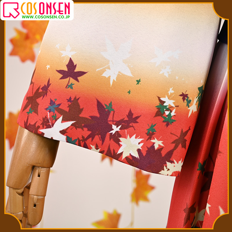 ポリエステルツイルで制作しています。肩に紅葉の花柄がプリントされて、裾に金色の縁飾りが施されて、原作を再現します。