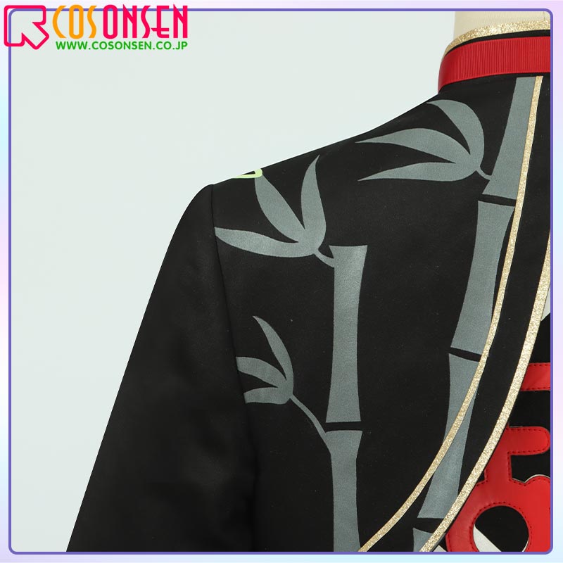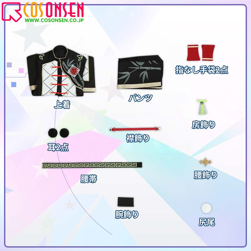 スエード生地とポリエステルツイルで製作しています。黒と白を基調として、左肩に竹の柄がプリントされた熊猫風の衣装、とても可愛いです。