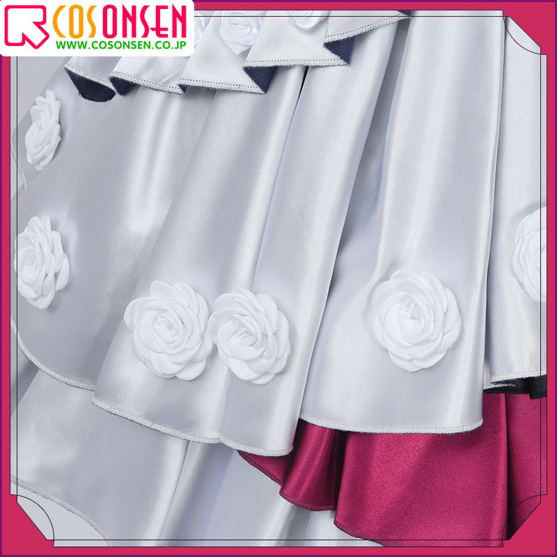 サテンで製作しています。白を基調として、右側はノースリーブで、左側は半袖で、ユニークなデザインで印象的です。スカート部分は多重プリーツスカートのデザインで、裾に白いバラが飾ってあり、超可愛いです。