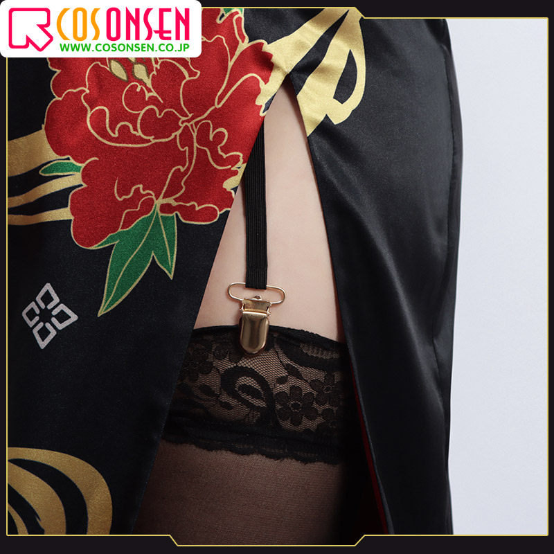 サテンで製作しています。黒と赤を基調として、スカート部分に牡丹の絵柄がプリントされて、華やかなワンピースです。炎のような形の裾があり、ユニークなデザインで印象的です。
